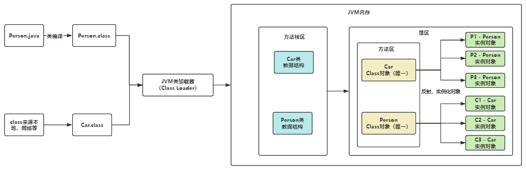 - 每个类都会有一个与之对应的Class实例,从而每个类都可以获取method反射方法,并作用到其他实例身上;