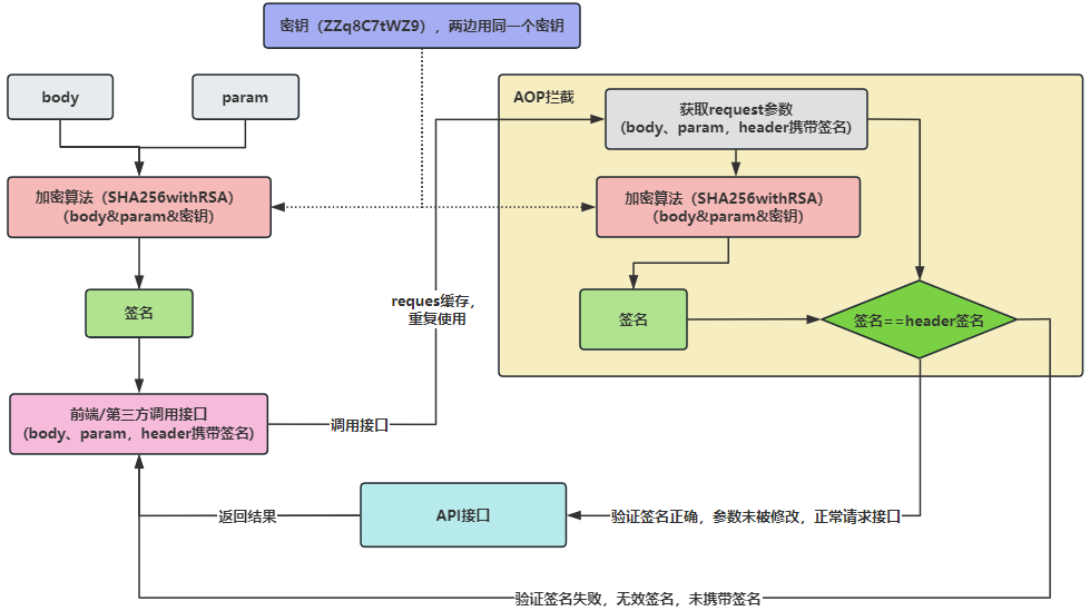 签名验证的核心还是通过AOP方式进行统一拦截,验证签名是否合法。这里做了两套验证,一个是前端的签名验证,另一个是服务端的签名验证。