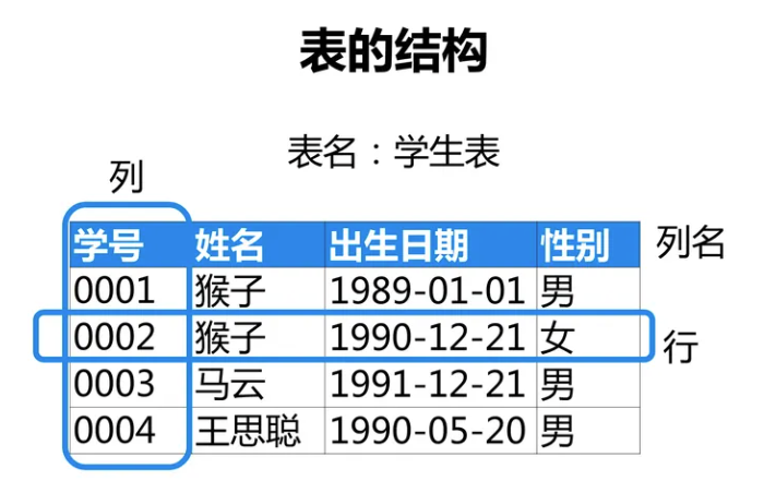 • :数据库中存储数据的基本单位,一个数据库中可以存放多个表,每个表都有一个名字,用来区分于数据库中的