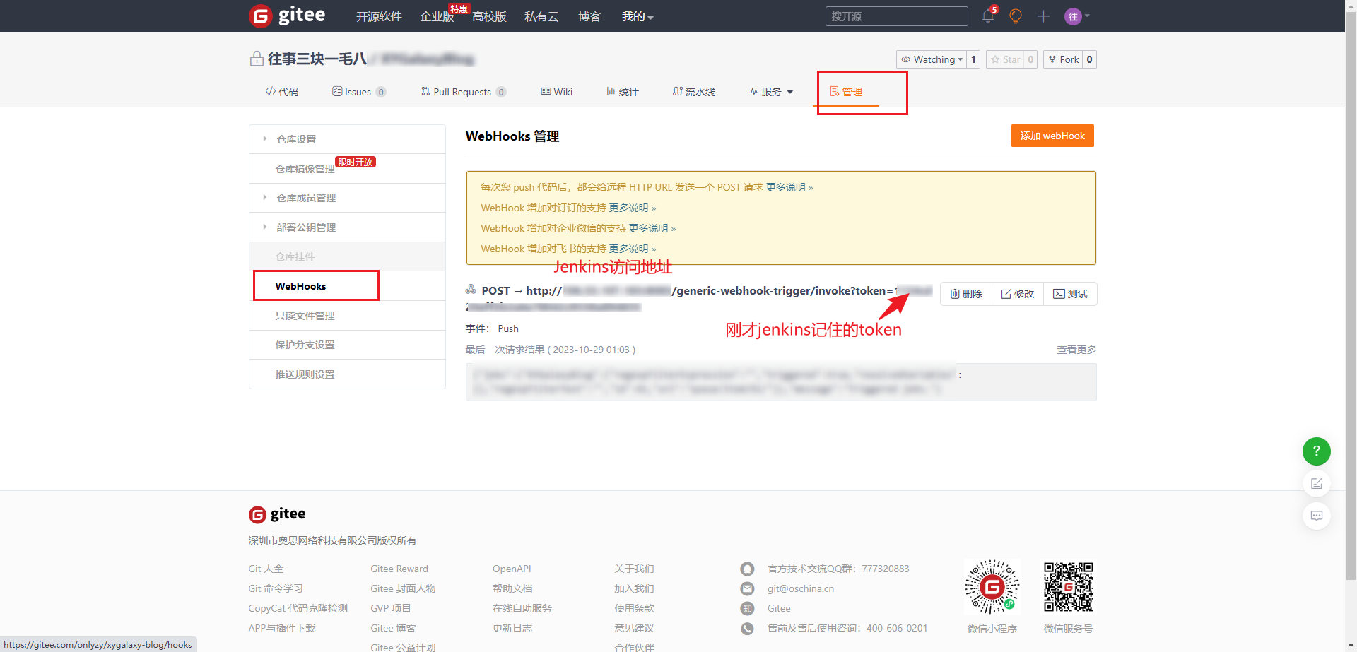 # 5、Gitee配置WebHooks
