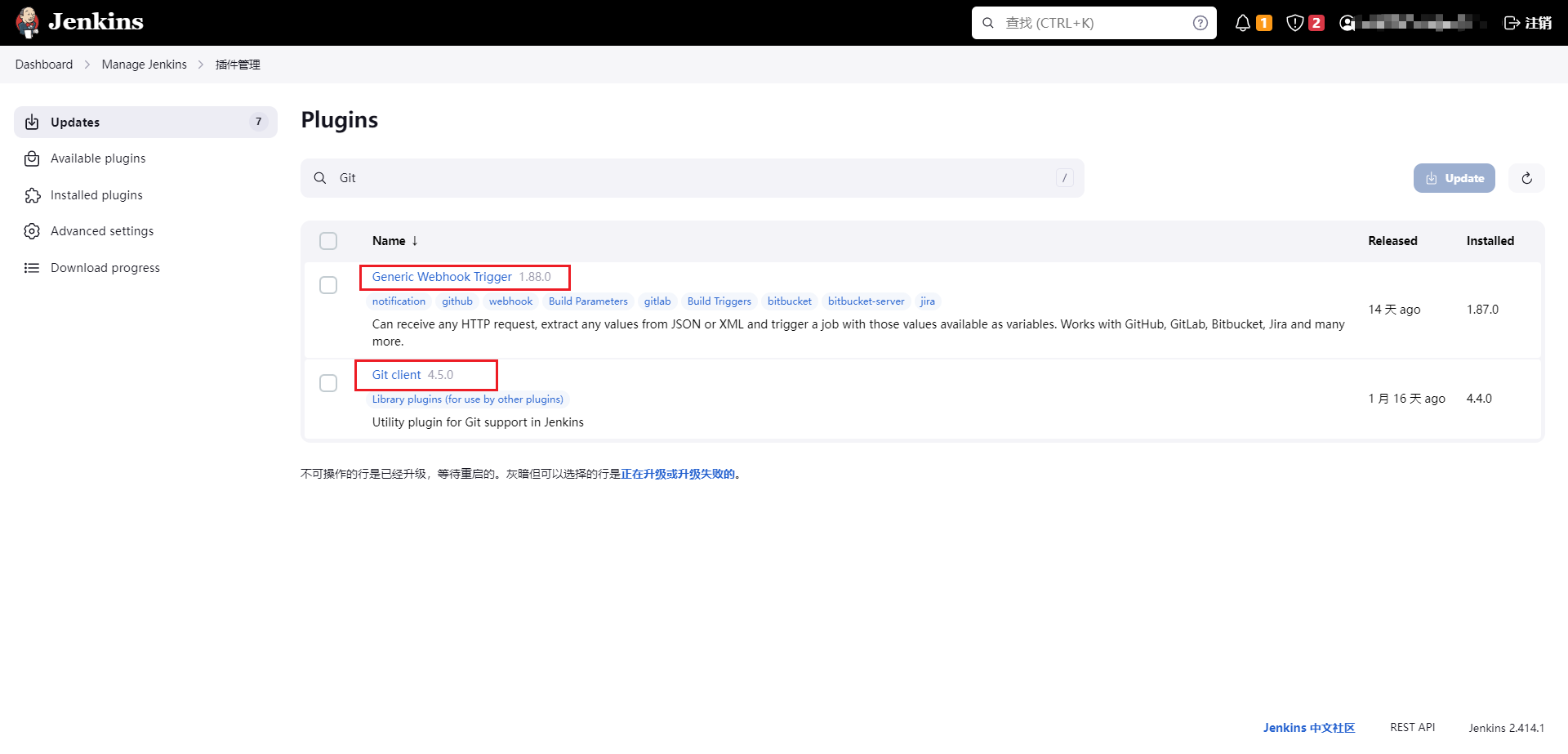 • 安装完成Jenkins安装必要的插件,这里只需要安装Git和WebHooks插件。